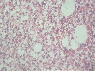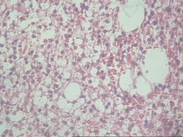 La biopsia de medula osea es muy importante para el diagnostico de leucemia de células peludas, debido a que en muchos casos solo existe infiltracion en este sitio. La medula es generalmente hipercelular , la toma puede ser focal o difusa, el termino parcial o en parche ha sido utilizado para describir lesiones focales. El patron difuso es mas comun donde grandes areas de la medula son reemplazadas por el tumor.(1,5-8) la extension de la infiltracion es acentuada en cortes marcados para linfocitos b. El infiltrado de células peludas es muy caracteristico en la mayoria de los casos formado por areas claras pobremente definidas que separan las células leucemicas. Los nucleos de las células peludas son redondos ovales o ligeramente lobulados, las figuras mitoticas son escasas. En algunos casos las células peludas son elongadas y fusiformes estas lesiones recuerdan una mastocitosis sistemica. La coloracion para reticulo muestra marcado incremento de las fibras de reticulina. Desde el punto de vista citoquimico un estudio importante en el diagnostico es la demostracion de la fosfatasa acida tartrato resistente. Las células leucemicas expresan antigenos asociados con células b cd19, cd20, cd24, hladr y cd22, son negativas para cd21 un marcador de diferenciacion temprana de células b, expresan cd25 y cd11c. Por microscopia electronica las células peludas muestran proyecciones citoplasmaticas, microvellosidades y pseudopodos.(1,9-11) el bazo muestra una infiltracion densa difusa de la pulpa roja y presencia de células malignas en los senos. El higado muestra una infiltracion difusa de los sinusoides por las células peludas. Los ganglios linfaticos muestran infiltracion difusa de los senos subcapsulares, corteza y cordones medulares. El diagnostico diferencial se realiza con otras proliferaciones de linfocitos pequeños como el linfoma esplenico con linfocitos vellosos, la variante de leucemia de células peludas, los linfomas de células b monocitoides, la leucemia prolinfocitica b. La variante de leucemia de células peludas debido a que la células son mas elongadas hay que realizar el diagnostico diferencial con la mastocitosis sistemica.el pronostico es generalmete bueno ya que se considera un linfoma de bajo grado de malignidad. Nuestros dos casos cumplieron los criterios histopatologicos para el diagnostico de leucemia de células peludas . El primero a pesar de existir solo infiltracion en medula osea fallecio por la trombocitopenia severa que lo llevo al sangramiento digestivo masivo , el segundo a pesar de tener infiltracion medular y esplenica evoluciono favorablemente lo que apoya al pronostico impredecible de esta entidad bien definida.