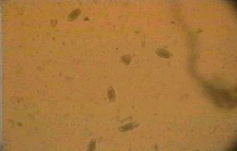 Estudio parasitológico de la muestra en fresco de heces( figura: 5): se reconoce el trofozoíto como un cuerpo ovoide, rodeado de cilios que suelen estar en constante movimiento, el parásito inferior muestra en el extremo izquierdo una depresión o escotadura que corresponde al Cistoma. Con éste método no es posible ver con facilidad el macronúcleo y micronúcleo