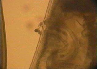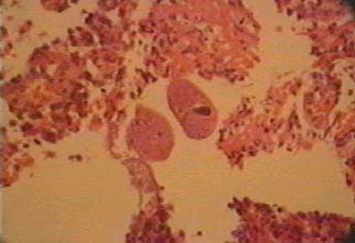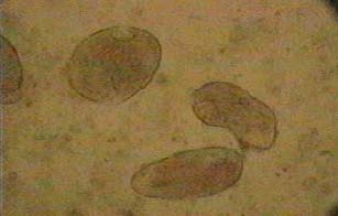 En las figuras: 10 y 11; Se observa en un campo varios huevos de parásito con la morfología "en barril" con los extremos operculados, el parásito hembra adulto, en el momento de la expulsión de los huevos, obsérvese la cantidad de los mismos que están en proceso de expulsión.