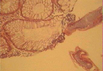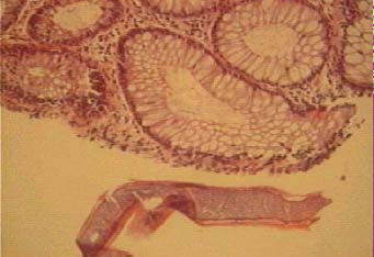 La mucosa cólica muestra luces glandulares y criptas con epitelio columnar sin mayores cambios, a nivel del corion el infiltrado es de tipo mixto con numerosos polinucleados eosinófilos y la presencia de los parásitos adultos en cortes sagitales, uno de ellos adherido a la mucosa. (figuras 12 y 13 ).
