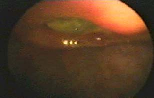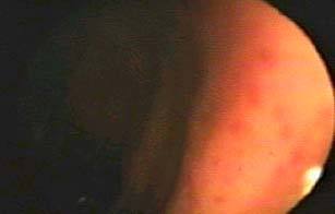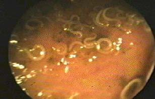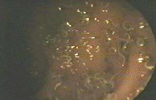 En la rectosigmoideoscopía se observa una infestación masiva por larvas de tricocéfalos, nótese la forma en la que los parásitos se adhieren a la mucosa intestinal, la misma que presenta marcado edema, congestión y microhemorragia. (figuras: 8 y 9).