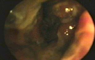 El estudio endoscópico muestra varios tipos lesiones, en la figura:2, se observa múltiples erosiones y ulceraciones de la mucosa, semejantes a las observadas en la infección por amebiasis. Las figuras 3 y 4; presentan lesiones ulceradas múltiples, necrotizantes en un fondo hemorrágico.