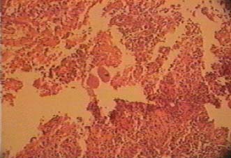 En el estudio histológico de las muestras de mucosa intestinal, (figuras: 6 y 7). Se aprecia mucosa cólica, con cambios inflamatorios severos, necrosis de coagulación, restos de celulares en parcial conservación, una respuesta inflamatoria de tipo mixto y la presencia del parásito, que se tiñe intensamente con los colorantes corrientes, con un citoplasma eosinófilo, con una granulación evidente y microvacuolas claras, de forma paracentral una gran núcleo basófilo de forma de "riñón" o en "pera", aunque pueden verse formas parasitarias sin núcleo con una coloración eosinófila homogenea.