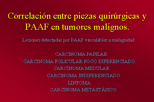 Las PAAF con diagnóstico de malignidad, en los 42 casos correlacionados con sus respectivas piezas quirúrgicas, se distribuyeron en los tipos histológicos arriba mencionados.