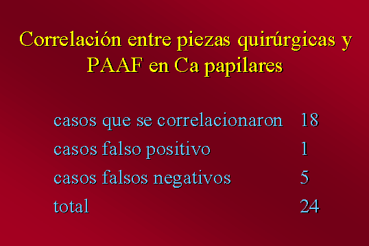 Esta tabla nos demuestra la correlación aceptable para el carcinoma papilar, con la baja presentación de falsos positivos, generalmente asociados a la tendencia a forzar el diagnóstico del material de PAAF sin reunir los criterios suficientes para el carcinoma papilar. Con respecto a los falsos negativos, creemos que fuera de la experiencia del observador en el microscopio, tiene una fuerte incidencia la capacidad del operador en la aspiración adecuada del nódulo a explorar.