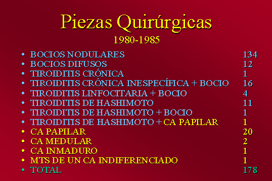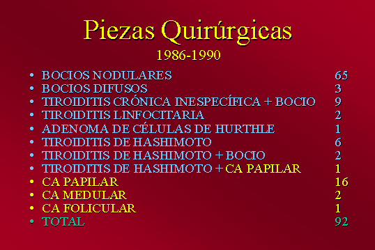 Se observan los resultados de las piezas quirúrgicas de los distintos períodos. En estas tres tablas podemos apreciar la disminución de las intervenciones quirúrgicas. El equipo de endocrinólogos de nuestro hospital, a las lesiones foliculares de tipo II y III, las envían a cirugía. Otros grupos prefieren ser más conservadores, y por lo tanto estas cifras podrían variar en menos.
