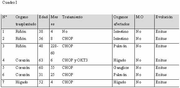 De acuerdo con los datos representados en el cuadro I, la edad de los pacientes osciló entre 31 y 63 años, el tratamiento inmunosupresor fue con ciclosporina, azotioprina y prednisona, uno de los trasplantados cardiacos recibió CD3 Ig (OKT3) la dosis media y la duración del tratamiento fue la standard en todos los trasplantados. El tiempo transcurrido desde el trasplante hasta el diagnóstico fue de 3 a 60 meses. La afectación fue preferentemente extranodal (dos en intestino, dos en pulmón, dos en hígado, y uno en ganglios).En sólo un caso el linfoma se desarrolló en el propio órgano trasplantado (hígado). La afectación multisistémica con infiltración de la M.O. se produjo también en un sólo caso que además coincidía con el de afectación ganglionar.