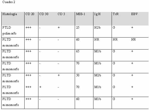 En el caso siete al desarrollarse el linfoma en el órgano trasplantado y sospecharse que pudiera haberse originado a partir de los linfocitos del donante se comparó el ADN de donante, receptor y tumor con técnicas de ampliación de regiones hipervariables mediante PCR demostrándose que el ADN tumoral era el similar al del donante.