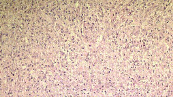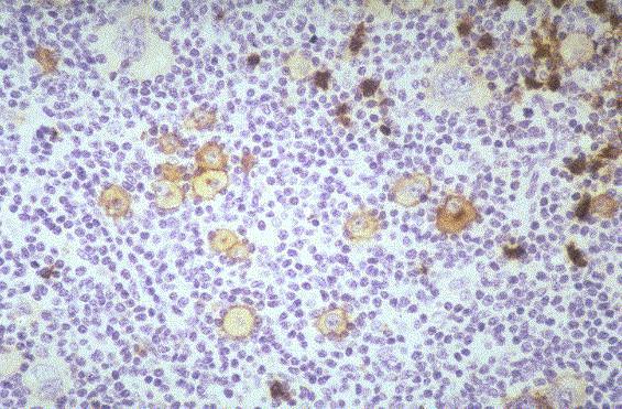 | Enfermedad de Hodgkin tipo celularidad mixta en paciente de 26 años, VIH+, con adenopatías, fiebre y pérdida de peso. Gran parte de las células atípicas son positivas para LMP-1 del VEB. |