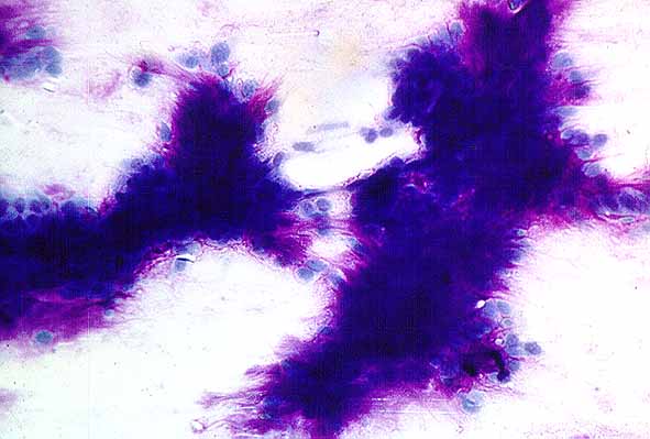 En nuestra opinión es uno de los patrones menos conocido, posiblemente debido a su escasa frecuencia. Las consecuencias de su desconocimiento son importantes ya que muestra grandes similitudes con el carcinoma adenoide quístico. En estos casos los extendidos muestran estructuras globulares de material estromal homogéneo, metacromático y rodeadas de elementos celulares. El patrón general es muy similar al observado en el carcinoma adenoide quístico. La celularidad de este ultimo tipo tumoral muestra grupos celulares con escasa cantidad de citoplasma, núcleos pequeños, hipercromáticos y núcleos desnudos en contraposición al AP donde el citoplasma, tanto en los grupos como en células aisladas, suele ser amplio. En estos AP con patrón cilindromatoso el estudio histológico evidencia zonas de morfología adenoide responsables de la imagen citológica. La expresión inmunohistoquímica de proteína gliofibrilar ácida por parte del AP ayuda a la diferenciación entre ambos tumores.