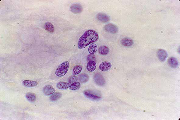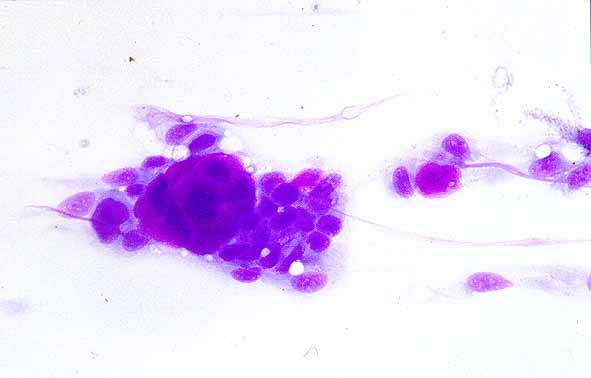 Generalmente, el pleomorfismo nuclear es moderado y no llega a los límites de hacer sospechar malignidad. Uno de nuestros casos, especialmente pleomórfico, fue responsable de un informe falso positivo (tumor mixto maligno). La atípia citológica por si sola no es criterio suficiente de malignidad en un AP y otros criterios citológicos (necrosis, predominio epitelial intenso, perdida de citoplasmas) y clínicos son necesarios para el diagnóstico preoperatorio de tumor mixto maligno. Aunque tratamos de evitar el uso de diagnósticos descriptivos en aquellos casos con marcada atipia si usamos el termino de AP con atípia epitelial y recomendamos inmediata comprobación histológica. No obstante esto ocurre muy raramente y en la mayoría de los casos de AP con atipia no se hace mención a ésta en el informe final.