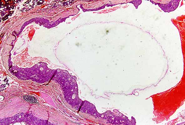 Otro problema importante es el relacionado con las lesiones quísticas. En nuestra serie el 7% de los AP mostraron componente quístico durante la aspiración. Es bien conocido que un numeroso grupo de procesos salivales (neoplásicos y no neoplásicos) se manifiestan como lesiones quísticas. Entre las neoplasias destacan: el carcinoma mucoepidermoide de bajo grado, tumor de Whartin, carcinoma acinar, carcinoma epidermoide metastásico y el AP. Nuestra serie incluye 7 casos que fueron diagnosticados citológicamente como lesiones quísticas no neoplásicas y que resultaron ser AP. Histológicamente estos casos evidenciaron cambios quísticos de tamaño variable (Fig.3).