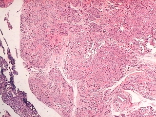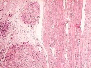 (91.2 KB) Figura 5:Borde del tumor en área vecina a la superficie serosa, H&E 40 x. |
