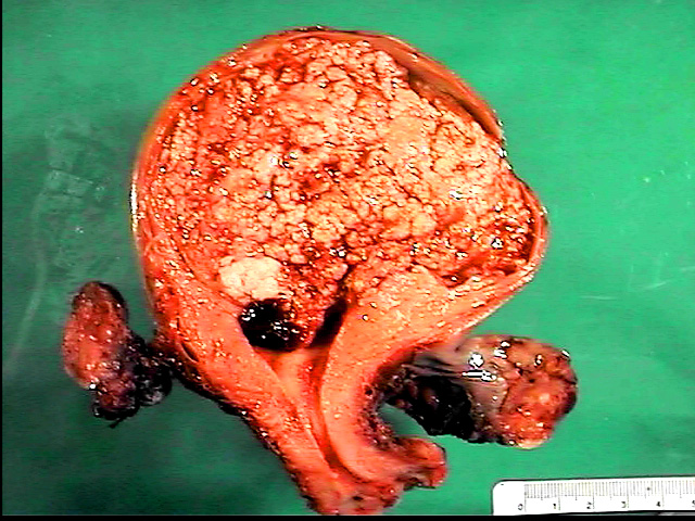 por abundantes nódulos en racimos de uvas, en el segmento uterino inferior existe un
