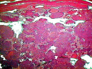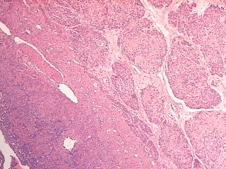(68.4 KB) Figura 3:Aspecto microscópico panorámico del tumor, se aprecian los múltiples nódulos que constituyen la lesión H&E 10 x. |