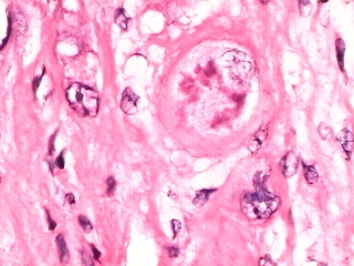 (78.9 KB) Figura 10:Mayor detalle de una célula de trofoblasto intermedio con cuerpos semejantes a los hialinos de Mallory. H&E 400x. |