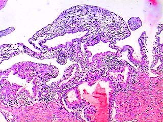 (76.4 KB) Figura 11:Superficie endometrial en donde se aprecia reacción seudodecidual del estroma y glándulas dilatadas. H&E 40x. |