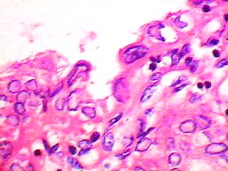 (54 KB) Figura 12: Mayor detalle de el epitelio glandulas endometrial con los característicos cambios nucleares de la reacción de Arias Stella, con pleomorfismo nuclear, cromatina alterada y núcleos opticamente claros. H&E 400x. |