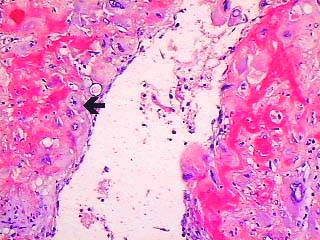 (62.6 KB) Figura 7: Vaso sanguíneo cuya pared ha sido extensamente substituída por trofoblasto intermedio, incluyendo algunas células endoteliales, parte de la pared del vaso tiene depósitos de material fibrinoide, se aprecia una mitosis (flecha) H&E 100x. |