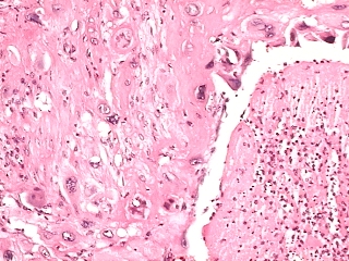(100 KB) Figura 9:Algunas células de trofoblasto intermedio muestran acúmulos citoplásmicos de material eosinófilo, semejantes a los cuerpos hialinos de Mallory. H&E 100x. |