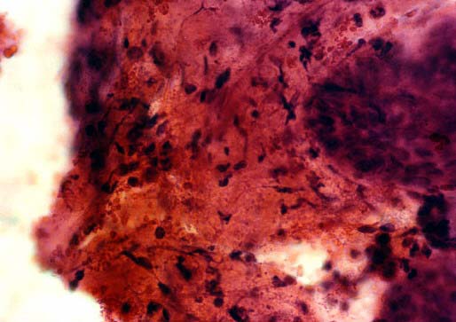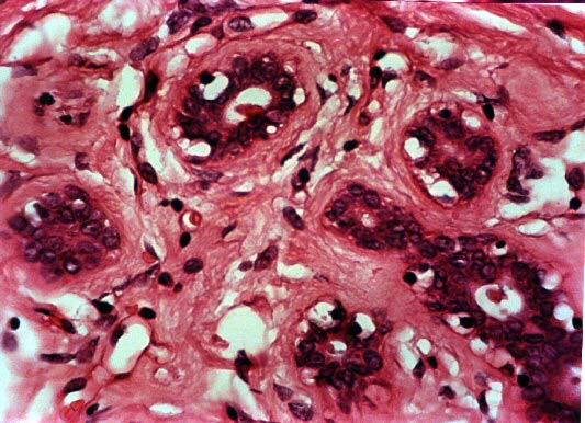 | Tejido conectivo con áreas de hialinización rodeando ductos poco desarrollados. |