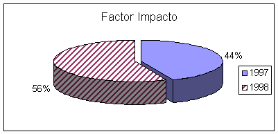 Al aumentar la facilidad de acceso a las técnicas informáticas, como podemos observar en las gráficas, vemos un aumento de la producción investigadora. Así, mientras en 1.997 el número de artículos publicados en Revistas Españolas y Extranjeras fue de 210, en 1.998 fue de 344. El Factor Impacto aumentó de 186,8 a 240,4 en dicho periodo.