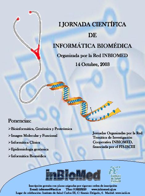 14 de Octubre de 2003 Lugar de celebración: Instituto de Salud Carlos III (C/ Sinesio Delgado nº 4-6, Madrid). Inscripción: gratuita, con plazas limitadas por riguroso orden de inscripción. E-mail: inbiomed@isciii.es. Tfno: 918223229. Organiza: Red Temática de Investigación Cooperativa INBIOMED, financiada por el FIS-ISCIII. Programa: 9:30-10:00. Acto de Inauguración. Dr. Luciano Sáez Ayerra. 10:00-11:30. Nuevos entornos de trabajo para la Informática Biomédica Moderador: Dr. Miguel Chavarría Participantes: Dr. José A. Heredia Dra. Montserrat Robles Viejo Dr. Oscar Coltell Simón Dr. Juan Díaz García 11:30-12:00. Café 12:00-13:30. La Informática Biomédica enfocada a la investigación: integración de datos moleculares, clínicos epidemiológicos y de imagen. Moderador: Dr. Carlos Martínez Riera Participantes: Dr. Fernando Martín Sánchez Dr. Víctor Maojo García Dr. José Crespo Dra. Gloria Bueno García Dr. Julián Dorado de la Calle 13:30- 15:00. Comida 15:00-16:30. Aplicaciones de la Informática Biomédica en la investigación sobre Salud. Moderador: Dr. Marcial García Rojo Participantes: