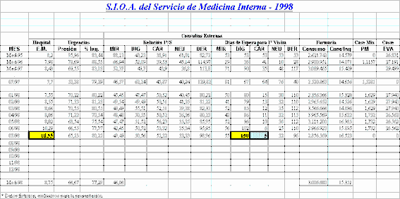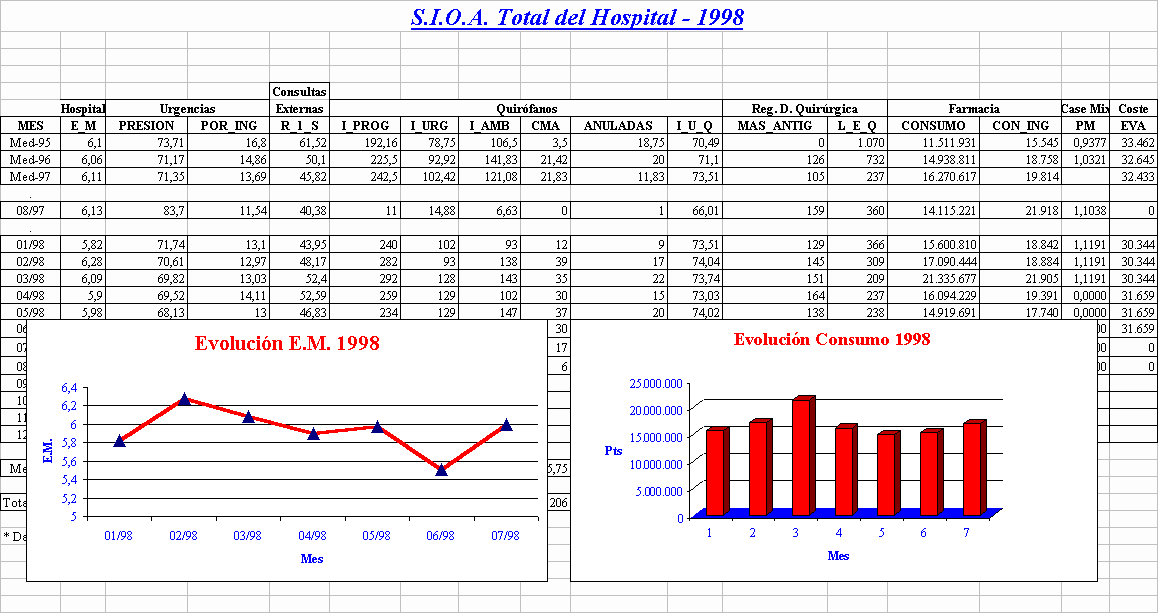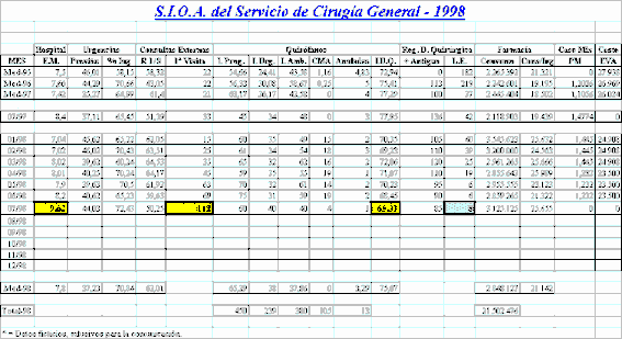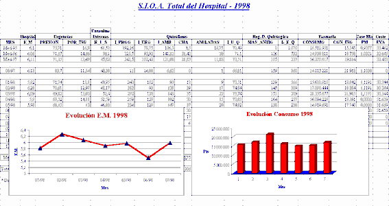 Los datos para la obtención de lo que denominamos Sistema de Información Operativo de Area (S.I.O.A.) se obtienen de diferentes sistemas: INIHOS (Indicadores InterHospitales), SIED.H (Sistema de Información de Equipos Directivos de Hospitales), SIED.D (Sistema de Información de Equipos Directivos de Distrito), S.I. Consultas Externas, Case-Mix, Registro de Demanda Quirúrgica y Lista de Espera, COAN (Contabilidad Analítica), SIGAP (Sistema de Información para la Gestión de Atención Primaria), Personal y Farmacia.