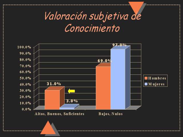 En el grupo que refiere tener conocimientos altos, buenos y suficientes existe diferencia significativa entre hombres y mujeres ya que el 31% de los hombres se se incluyen en este grupo por el 3% de las mujeres.