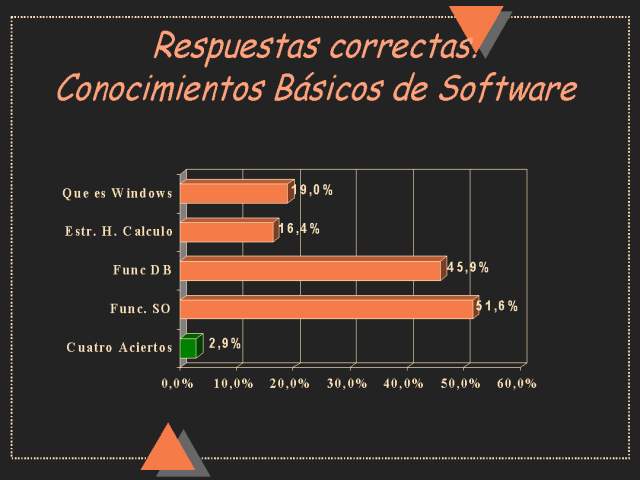 Los conocimientos sobre software son superiores a los de hardware, aunque cabe destacar que solo el 19% sabe lo que es Windows. Por el contrario el 51% y 45% respondieron adecuadamente las funciones del sistema operativo y las de las bases de datos.