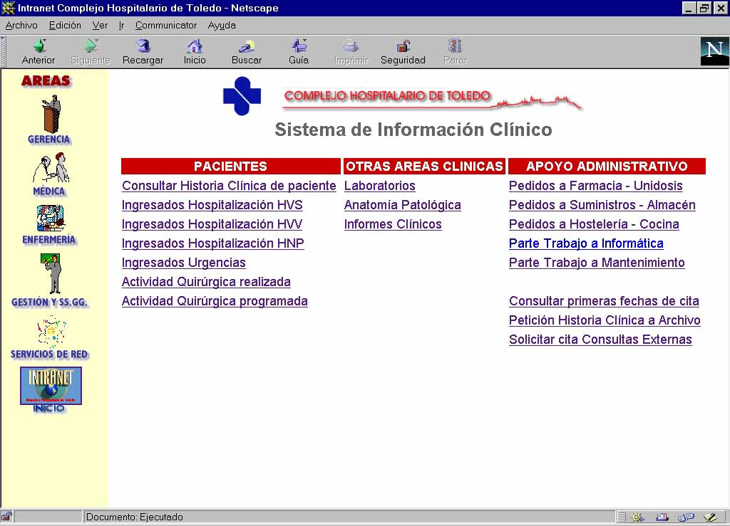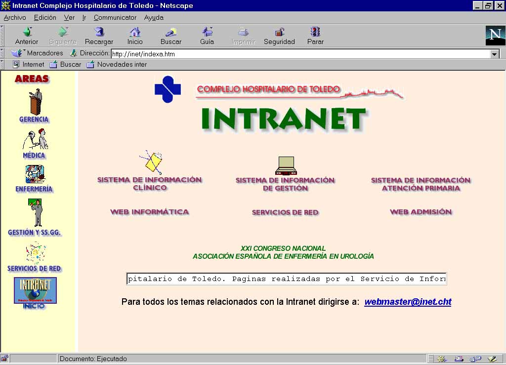Las aplicaciones INTRANET del Complejo Hospitalario de Toledo se ejecutan, actualmente, en un servidor web con sistema operativo Windows NT Server 4.0 y el software Internet Information Server. Próximamente está prevista su sustitución por un servidor de mayor capacidad de proceso y almacenamiento, con sistema operativo UNIX.