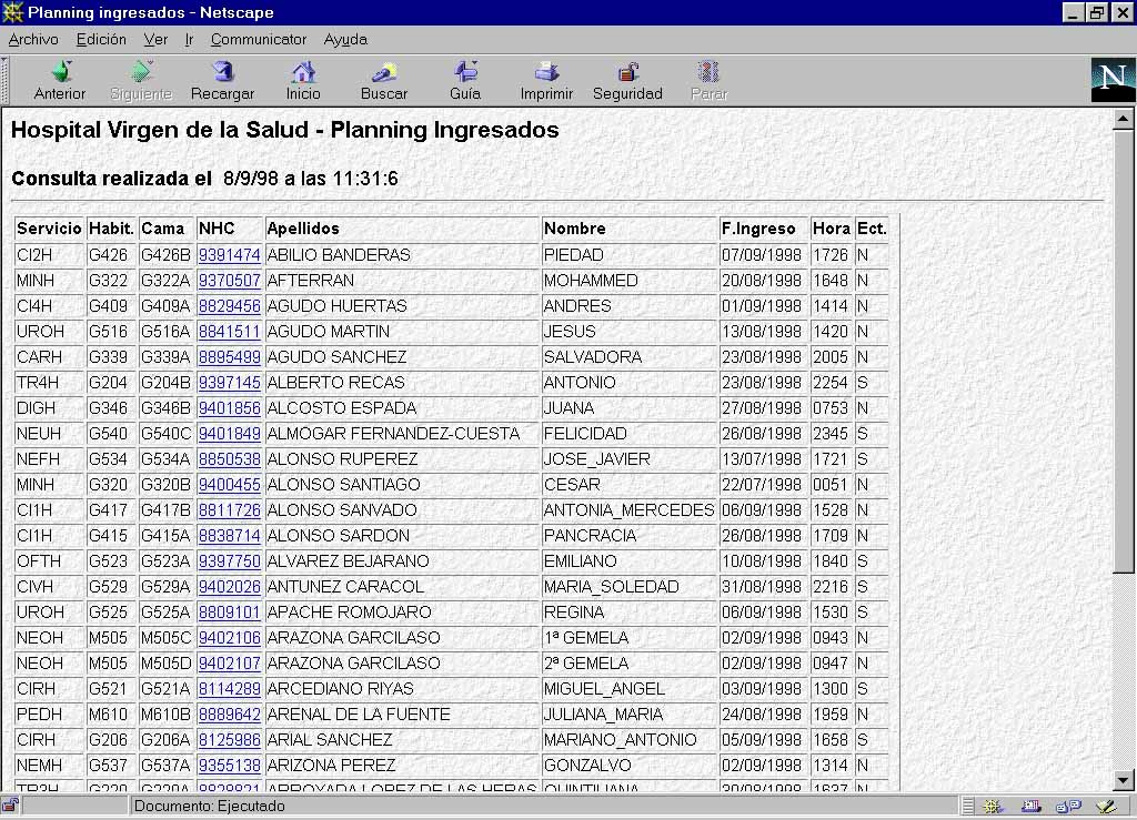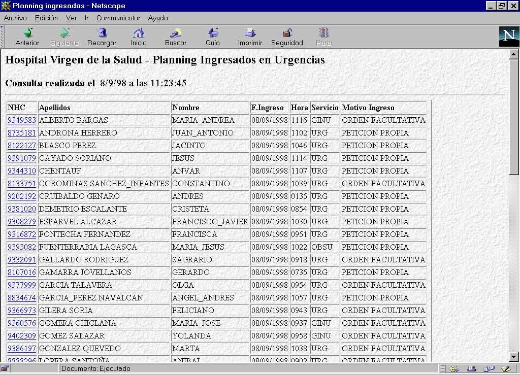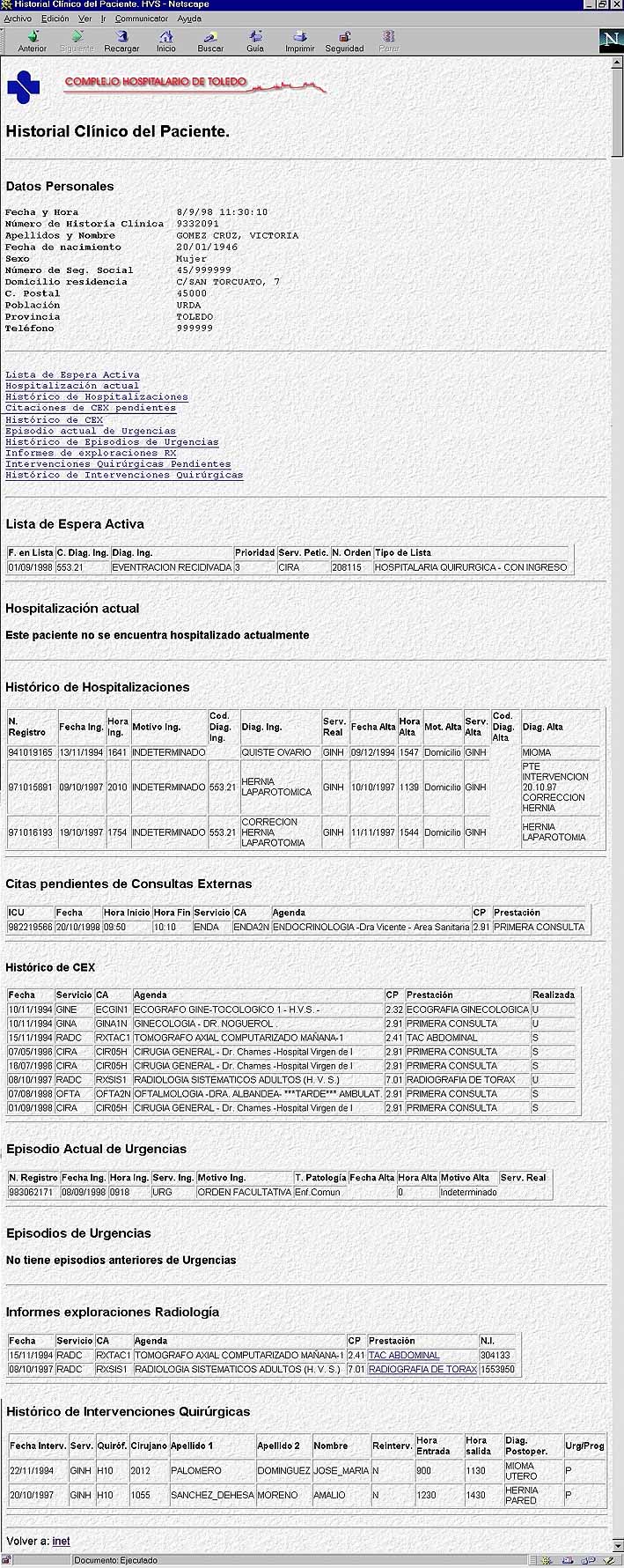 Desde 1990 se ha procedido, en el Complejo Hospitalario de Toledo, a la implantación y desarrollo de un considerable número de aplicaciones informáticas que recogen información de carácter clínico-asistencial: Admisión General, Urgencias, Consultas Externas, Actividad Quirúrgica, Archivo de Historias Clínicas, Facturación, Radiología, Informes Clínicos, Laboratorios, Anatomía Patológica, etc... Esto permite que en la actualidad dispongamos de un conjunto de bases de datos que integran un gran volumen de información respecto de nuestros pacientes.