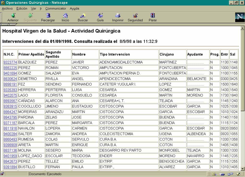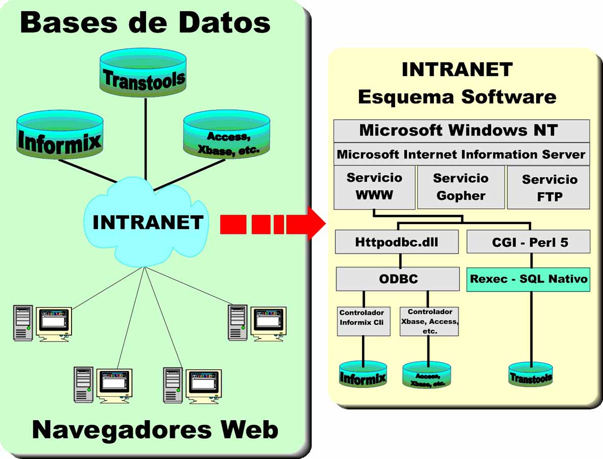 Las aplicaciones CGI de Intranet están desarrolladas en Perl, lenguaje multiplataforma, construyéndose dinámicamente las páginas HTML que visualizan la información solicitada según se va recuperando ésta de las diferentes bases de datos. Para el acceso a las diferentes bases de datos relacionales se utiliza ODBC (Informix, Access, xBase) y programas de ejecución remota (remote shell) en el caso de Transtools, base de datos que soporta actualmente la Gestión de Pacientes.