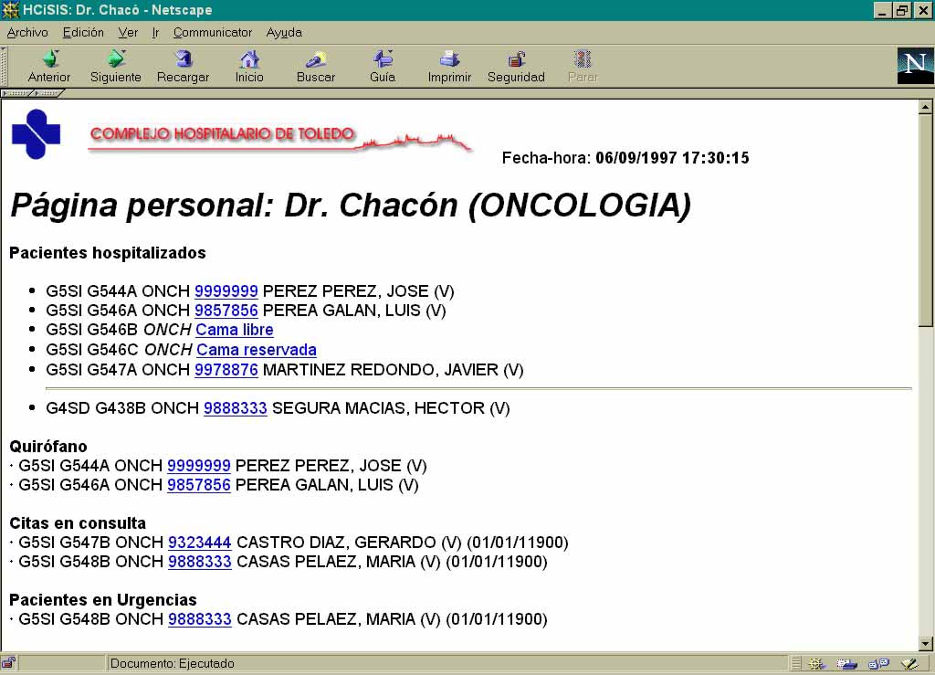 Sin embargo, esta información no ha estado disponible de forma directa e interactiva para el personal facultativo y asistencial, que es el que la genera y al que resulta de gran utilidad disponer de ella de forma directa. Por ello, y aprovechando las nuevas infraestructuras de comunicaciones en nuestros centros, hemos desarrollado, como área en la INTRANET hospitalaria, un Sistema de Información Clínico Asistencial, diseñado para cubrir las necesidades de un entorno hospitalario, pero con las extensiones adecuadas a los requerimientos de los Centros de Atención Primaria del área de salud.