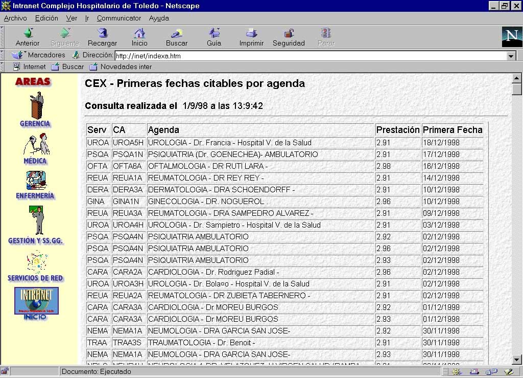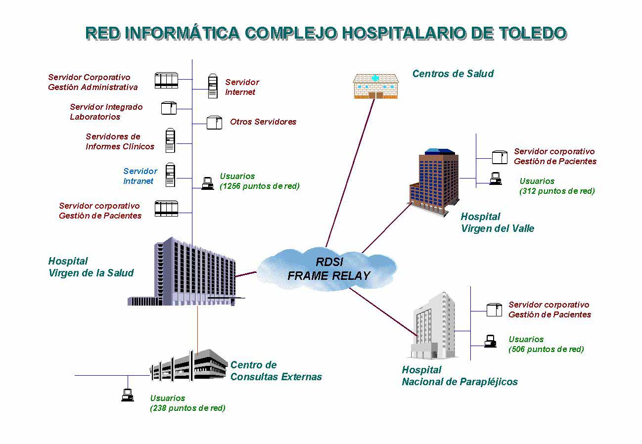 Actualmente, en la fase piloto, se accede a la INTRANET desde un total de 118 puntos de red situados en determinados servicios y/o unidades funcionales elegidos como "pilotos": Cardiología, Admisión y Codificación, Informática, Suministros, Unidad de Investigación. Para finales de octubre del presente año está prevista la finalización de la nueva red de datos del Complejo Hospitalario, lo que hará accesible la INTRANET desde 2100 puntos de red distribuidos por los diferentes centros del mismo (Hospital Virgen de la Salud, Hospital Virgen del Valle, Hospital Nacional de Parapléjicos y Centro de Consultas Externas). Así, se incorporarán al sistema Controles de Enfermería, Urgencias, UVI, Quirófanos, Secretarías y despachos de servicios clínicos, servicios centrales y en general todos aquellos puntos desde los que se tiene un contacto directo con el paciente.