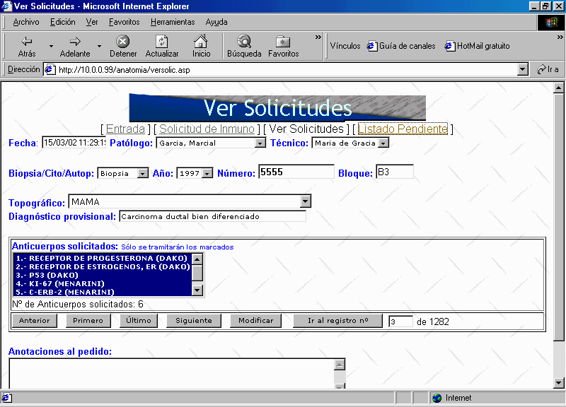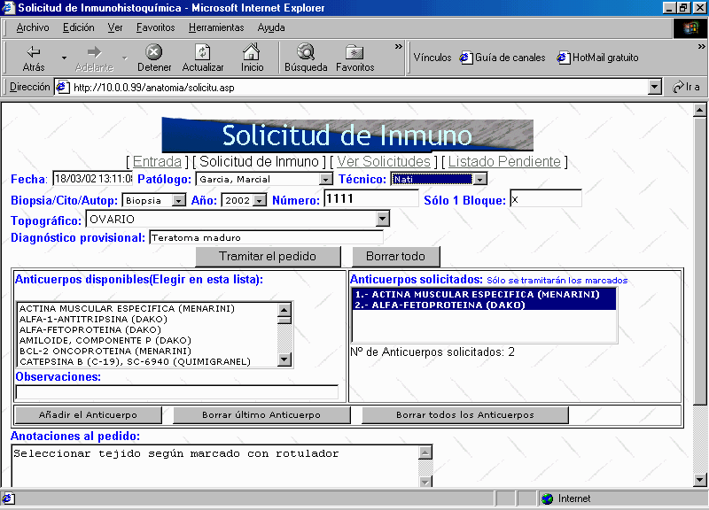 Resultados Intranet y solicitud de técnicas especiales en Anatomía Patológica Para la solicitud de técnicas inmunohistoquímicas e histoquímicas se han confeccionado páginas web ASP que permiten disponer de un sistema permanentemente activado en el laboratorio que alerta a los técnicos de nuevas solicitudes. La gestión de datos se realiza mediante ficheros de base de datos Access, lo que permite el intercambio de información con el programa Dako Qualitrack 1.0 (gestión de colocación de portas en el sistema automático Techmate Horizon (para inmunohistoquímica, histoquímica, e hibridación in situ).