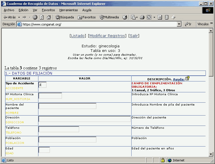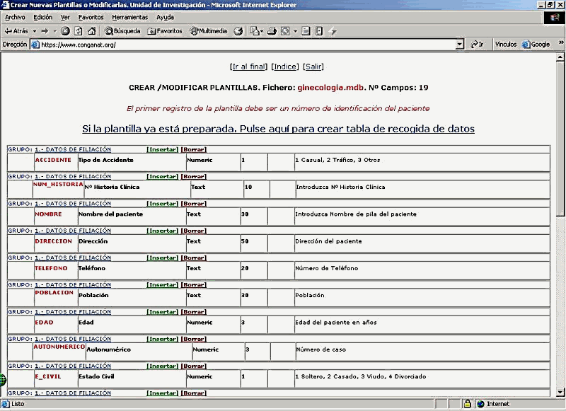 Gestión de formularios en la Unidad de Investigación El sistema de programación en páginas ASP ha permitido separar, por una parte, la definición de los campos necesarios para el formulario de cada investigación o estudio estadístico y, por otra parte, las tablas de recogidas de datos. El Coordinador (personal de la Unidad de Investigación) gestiona la creación de nuevos estudios y la estructura que cada estudio debe adoptar. A través de formularios web e hipertexto se va creando la plantilla adecuada. Una vez creada la plantilla, se crean las tablas de recogida de datos correspondientes. Si se trata de un proceso de modificación de plantilla y estas tablas ya estaban creadas e incluso contenían datos, estos datos se importan a la nueva definición de datos, por lo que el estudio puede ser modificado en cualquier momento y nunca se pierden datos anteriores a la modificación del estudio, pues quedan almacenados en copias de respaldo. La gestión de usuarios del sistema permite controlar los usuarios conectados en cada instante y todos los cambios son registrados, incluyendo el nombre del usuario, la fecha del cambio y la dirección IP del ordenador. El investigador entra en el sistema identificándose con una clave que sólo le permite añadir y modificar el rango de datos asignado (especialmente útil para estudios multicéntricos), con una interfaz sencilla, como la mostrada en la figura: Las ventajas de este sistema incluyen: Codificación numérica previa de las variables que permite un registro (volcado) rápido de las mismas En estudios pilotos se pueden usar los datos de los mismos en la creación de la nueva plantilla. Versatilidad a la hora de realizar nuevos CRD (cuaderno de recogida de datos) según la evolución del estudio. Si se olvida una variable, se añade fácilmente. Volcado de los datos por Internet. Esto permite realizar estudios multicéntricos. Esto permite conseguir mayores muestras y permite contestar preguntas de investigación más relevantes Control de calidad en la introducción de datos Codificación del tipo de variable según (vinculado al) el análisis estadístico posterior. Si es dicotómica, sólo puede hacerse un Chi cuadrado. Facilita saber qué test se utilizará en cada variable. Publicación de la Revista Española de Patología