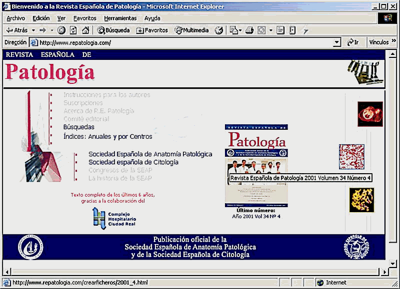 En la portada inicial del web de la revista ya están funcionando los siguientes servicios: Búsquedas. A través de un formulario podremos realizas búsquedas por múltiples criterios (títulos, palabras clave, autores y centro) Índices. Además del índice anual de la revista, están disponibles los índices por autores y por centros e instituciones (clasificados por comunidades autónomas o países y provincias). Texto completo de los artículos. Una vez localizado el artículo deseado, a partir del año 1996, inclusive, podemos acceder también al texto completo de todos los artículos, en formato PDF. Instrucciones para los autores. Además de la información incluida en cada número de la revista se incluyen instrucciones más detalladas sobre aspectos como el formato adecuado de la bibliografía y la digitalización de imágenes. Acerca de R.E. Patología. Es un repaso histórico de los editores o directores de la revista y comités editoriales a lo largo de la historia de esta publicación científica, desde 1968. Enlaces a las páginas web oficiales de la Sociedad Española de Anatomía Patológica y la Sociedad Española de Citología