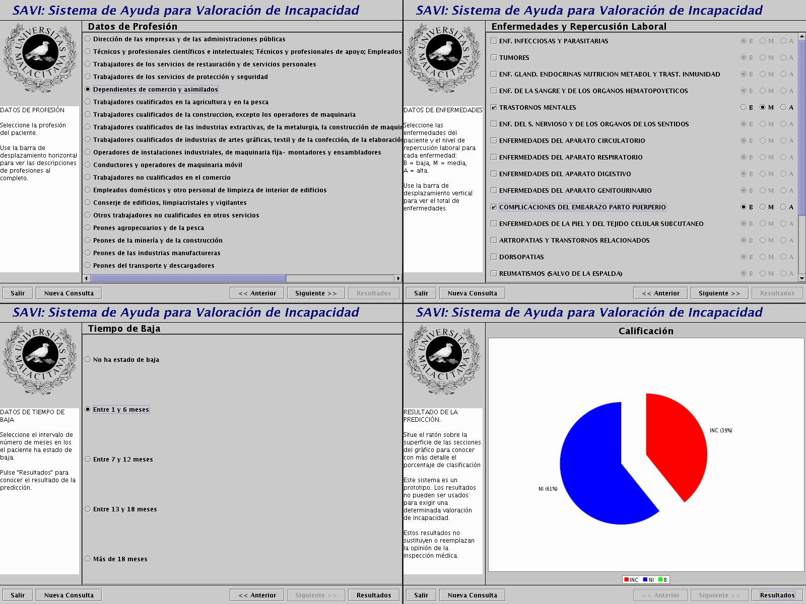 1. Introducción La automatización de procesos se integra cada día más en nuestra sociedad. Del resultado de esta automatización se obtienen datos "informatizados" que en ocasiones son almacenados y en ocasiones descartados. Dado el abaratamiento de la tecnología de almacenamiento lo más frecuente suele ser almacenar la mayor cantidad de datos posible. Esta recolección de datos automática producen tremendas cantidades de datos almacenados en bases de datos, almacenes de datos (data warehouses) y otros repositorios de información. La prospección de datos [1] nace con el fin de extraer información interesante desde datos almacenados en grandes bases de datos. Con "información interesante" nos referimos a no trivial, implícita, previamente desconocida y potencialmente útil. La prospección de datos combina técnicas de estadística clásica y técnicas de inteligencia artificial como aprendizaje estadístico y computacional. Al hablar de prospección de datos debemos hablar del proceso de prospección. Existen diferentes metodologías, la más aceptada y por la que nos hemos decantado es la guía CRISP-DM [2]. En ella se define un modelo jerárquico de tareas a cuatro niveles de abstracción: En el nivel más alto el proceso se organiza en un número de fases; cada fase consiste en varias tareas genéricas de segundo nivel. Las tareas específicas solucionan tareas genéricas en situaciones específicas. Y los procesos son cada una de las aplicaciones de las tareas específicas a datos. 2. El Proceso CRISP-DM El modelo de proceso provee una visión global del ciclo de vida de este tipo de proyectos. Este ciclo de vida contiene las fases del proyecto, sus respectivas tareas y las relaciones entre estas tareas. El interés de esta sección es describir, a nivel de fases, el ciclo de vida de la guía CRISP-DM [2]. El ciclo de vida de un proyecto de prospección de datos consta de seis fases (figura 1). La secuencia de realización de estas fases no es estricta, se requieren movimientos de una fase a otra en base a los resultados obtenidos durante el proceso. Las flechas indican las dependencias más frecuentes entre las diferentes fases. El círculo exterior simboliza la naturaleza cíclica de la prospección de datos. La prospección de datos no concluye cuando se encuentra una solución, pues esta solución puede abrir nuevas puertas a explorar. La iteración en el proceso beneficia la experiencia adquirida en la iteración anterior. La fase inicial del proceso de prospección de datos (comprensión del problema) está enfocada en la comprensión de los objetivos y requisitos del proyecto desde una perspectiva del cliente. En la comprensión de datos se recopilan los datos necesarios para el desarrollo del proyecto, se ofrece información de la estructura de estos datos, de su calidad y subconjuntos de interés. En la preparación de datos se cubren todas las actividades para construir los conjuntos de datos finales (datos que serán utilizados en las herramientas de modelado) a partir de los datos en bruto iniciales. En el modelado se seleccionan y aplican diferentes técnicas y sus parámetros son calibrados a los valores óptimos. Antes de proceder con el desarrollo final del modelo, es importante una evaluación más profunda y una revisión de los pasos seguidos en su construcción para asegurar que sus propiedades están dentro de los objetivos del proyecto. 3. Proceso de Prospección de Incapacidad Permanente (IP) En esta sección se exponen los resultados de la aplicación de la metodología CRISP-DM a datos de Incapacidad Permanente. Se presenta un resumen del informe final (trabajo completo en [3]), en el que quedan recogidos los resultados de cada una de las fases. Con esto se pretende dar una visión general de lo que sería el desarrollo de un proceso de prospección. No pretende ser un estudio exhaustivo de la Incapacidad Permanente, pues el conjunto de datos usado es limitado (978 expedientes). En los siguientes puntos se presenta el resultado de cada una de las fases del proceso: Comprensión del Problema: El Real Decreto 1300/95 establece las competencias que en materia de incapacidad laboral permanente le corresponde al Instituto Nacional de la Seguridad Social (INSS). Dicho texto legal crea en las Direcciones Provinciales del INSS los Equipos de Valoración de Incapacidades (EVI). La incapacidad permanente (IP), en su modalidad contributiva, tiene en cuenta la alteración continuada de la salud y, fundamentalmente, la incidencia que dicha alteración tiene en la realización de la actividad profesional. Tiene un perfil exclusivamente profesional y su calificación debe obviar toda referencia a otras circunstancias (socio-económicas, de edad, familiares, etc.). Se clasifica conforme a los siguientes grados: IP Parcial, IP Total, IP Absoluta, Gran Invalidez y Lesiones Permanentes No Invalidantes. En base a lo expuesto, los objetivos del problema son dos: aportar al INSS una serie de datos que permitan a los Médicos Inspectores tener una aproximación, previa a la evaluación individualizada, del resultado que cabe esperar en cada uno de los expedientes de IP y permitir satisfacer las expectativas de los beneficiarios de la Seguridad Social. Se pretende que los asegurados conozcan en cada momento, si su situación clínico-laboral es susceptible de generar una IP con el menor margen de error posible. Comprensión de datos: La tarea principal de esta fase es la Descripción de datos. En esta tarea se examinan, a groso modo, las propiedades de los datos capturados. En el informe se describen el tamaño de los datos (análisis volumétrico) y su formato, se realizan medidas estadísticas básicas y se analiza el significado de los resultados, por ejemplo la relevancia de un atributo para los objetivos y su comparación con la opinión del experto del dominio. La Unidad Médica del EVI elabora los Informes Médicos de Síntesis (IMS) como documento preceptivo para
