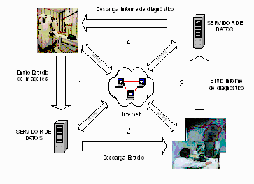 El sistema lo constituyen dos aplicaciones (aplicación de técnico y de diagnóstico) que cubren el ciclo de vida (Figura 2) de un estudio radiológico. Los estudios son realizados en los centros proveedores de imágenes, quienes envían las imágenes digitales en formato DICOM a los servidores ASP (1) mediante la aplicación del técnico. Estos estudios son descargados por los radiólogos/as desde la aplicación de diagnóstico (2), que proporciona las herramientas necesarias para analizar los estudios y emitir el diagnóstico, incluyendo el acceso a recursos de proceso en paralelo para la ejecución de aplicaciones computacionalmente costosas. Una vez completado el estudio, se procede al envío del informe (3) que queda almacenado en el servidor de datos para que pueda ser descargado desde la aplicación de técnico (4). Todas las aplicaciones son accesibles desde un navegador web, reduciendo los requerimientos de los clientes que quedan concentrados en los servidores ASP.