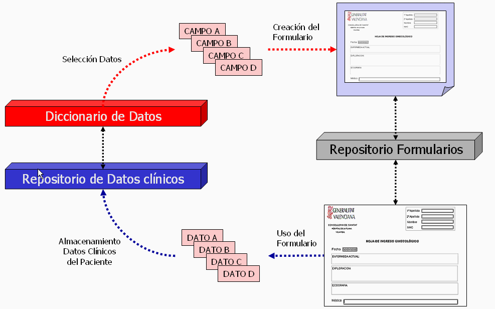 Novasoft Sanidad S.A. Resumen. La informatización de los datos clínicos que son utilizados por el personal asistencial en el ejercicio de sus funciones supone un importante reto, no tanto por las técnicas informáticas que pueden ser aplicables sino por la necesidad de plantear nuevas arquitecturas que den respuesta a todas las necesidades. Entre estas es necesario facilitar al máximo el aprendizaje de este tipo de soluciones, centralizar los datos recogidos en un único repositorio común a todos los formularios utilizables (Historia Clínica Única), y la utilización de diccionarios normalizados de datos a partir de los cuales sea posible construir los formularios que necesitan el personal clínico. A continuación se muestran las características más importantes de nuestro aplicativo eHC, desarrollada utilizando J2EE (Java) y la arquitectura más innovadora. 1. Introducción Nuestro aplicativo e-HC nace ante la necesidad de disponer de una herramienta de recogida, almacenamiento, selección, explotación y administración de información clínica. La recogida y consulta de estos datos clínicos es realizada en base a formularios protocolizados. eHC permite definir y diseñar toda aquella información que los facultativos necesitan registrar en los formularios que forman parte de la Historia Clínica del paciente con los siguientes objetivos y características: Aporta una solución integral en la gestión de toda la información que forma parte de la Historia Clínica de un paciente. Es el propio facultativo o responsable del Servicio el que define y decide qué información se presentará dentro de la Historia Clínica y en qué forma. e-HC no se mantiene dentro de los típicos recursos de gestión que sólo aportan información administrativa, sino que se trata de una herramienta polivalente, convirtiéndose en un apoyo al diagnóstico y ayuda al profesional. Al tratarse de una herramienta que mantiene un control vertical y horizontal del flujo de trabajo, podemos detectar en cualquier momento cuál o cuáles son los puntos susceptibles de mejora. Es posible diseñas personalmente los formularios que forman parte de la Historia Clínica del Paciente. De esta forma, es el propio facultativo el que decide qué información desea reflejar en la Historia Clínica y cómo se presentará mediante el diseño personalizado del formulario que registra dicha información. La aplicación separa mediante opciones de un menú principal las funciones que se permite realizar, además dichas funciones son accesibles desde un menú con iconos situados en la parte izquierda de la pantalla. El manejo de la aplicación se realiza a través de un interfaz gráfico intuitivo y sencillo que facilita su uso a todo tipo de usuario. El formulario es visualizado en pantalla de una forma similar a su equivalente en papel. De esta forma el usuario encuentra una representación que le es familiar (el clásico formulario que él ha usado siempre) y que por tanto facilita enormemente el aprendizaje en el uso del mismo. 2. Funcionalidades Básicamente podemos definir que el aplicativo eHC da respuesta a los siguientes procesos o acciones principales: 2.1. Definición de Campos Mediante esta opción es posible definir aquellos campos de datos que posteriormente podrán formar parte de los formularios que se encargarán de recoger y explotar la información de la Historia Clínica del paciente. Se engloban en este apartado la definición, Consulta y Modificación de Campos. Definimos Campo como la unidad de información elemental a incorporar dentro de un formulario, esto es, un formulario estará formado por "n" campos. Existen distintos tipos de campos (por ejemplo, desplegable, multiselección, texto libre, imagen, valores repetitivos, fechas, horas, etc). Todos los datos clínicos que son insertados en el sistema mediante campos que permitan la recogida codificada de la información tendrán la gran ventaja de su posterior explotación. Por el contrario toda la información que se inserte en el sistema como texto libre no podrá ser explotada. A la hora de definir los campos tendrán que ser registradas las características de los mismos: Referencia (valor secuencial asignado por la aplicación que servirá para identificar el campo unívocamente en la captura de datos), Observaciones (descripción del campo), Etiqueta (título que identifica el campo), Tipo de campo (se especificará el campo según los tipos definidos), Máscara de presentación, Obligatoriedad (si un campo es de obligada cumplimentación lo será para todos los formularios en los que aparezca, pero en el caso que solamente lo sea en algunos, la obligatoriedad deberá ser especificada a nivel de formulario), Modificable (campo lógico que igual que el caso anterior podrá ser especificado a nivel de formulario), Activo, Fecha de creación, Fecha de inactividad, Usuario que creó el campo, Usuario de inactividad, Controles (por ejemplo, las condiciones de cumplimentación de campos), etc. 2.2. Definición de Formularios Mediante esta opción podremos definir aquellos formularios que se encargarán de recoger y explotar la información de la Historia Clínica del Paciente. Se distingue en este apartado la Definición, Consulta, Modificación y Diseño de Formularios. Denominamos "Formulario", a la guía estructurada de recogida y gestión de información clínica durante el acto asistencial, que permitirá la recogida de datos homogénea y sistemática por parte de los profesionales. Para poder definir un formulario, previamente se han tenido que crear aquellos campos que lo constituyen. De la misma forma que se ha indicado en la creación de los campos, en la creación de un formulario se deberá asignar una serie de características al mismo: Referencia, Descripción o etiqueta, Fecha de creación, Fecha de inactividad, Actividad, Cierre, Tipo de formulario (pudiéndose indicar si el formulario es único por paciente o por episodio). En la