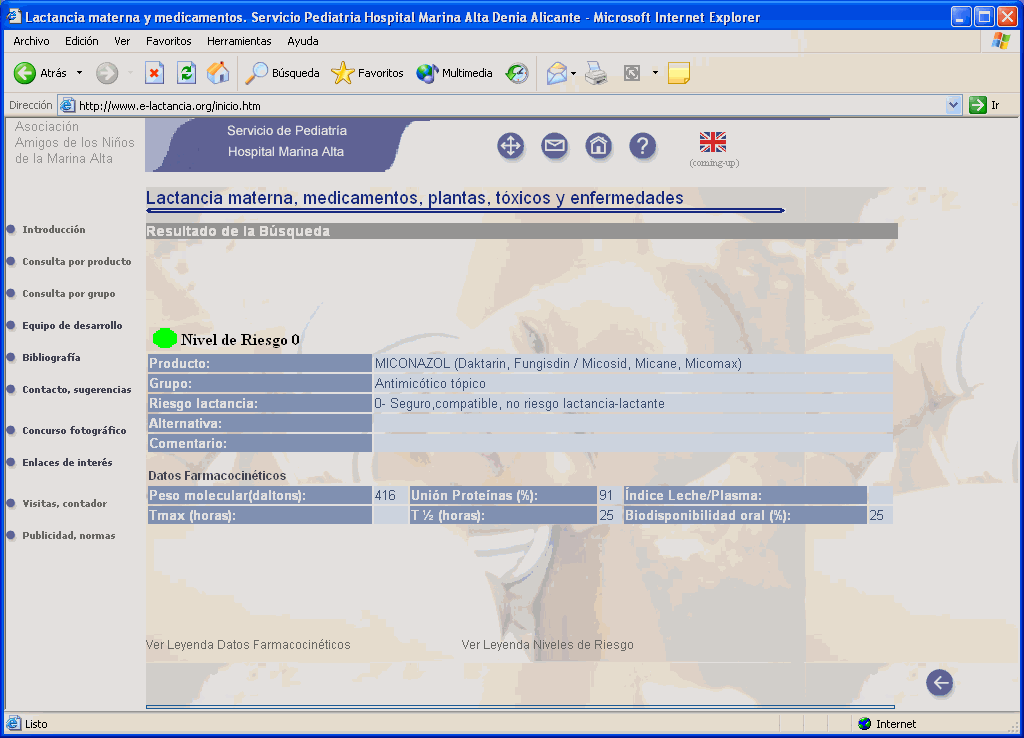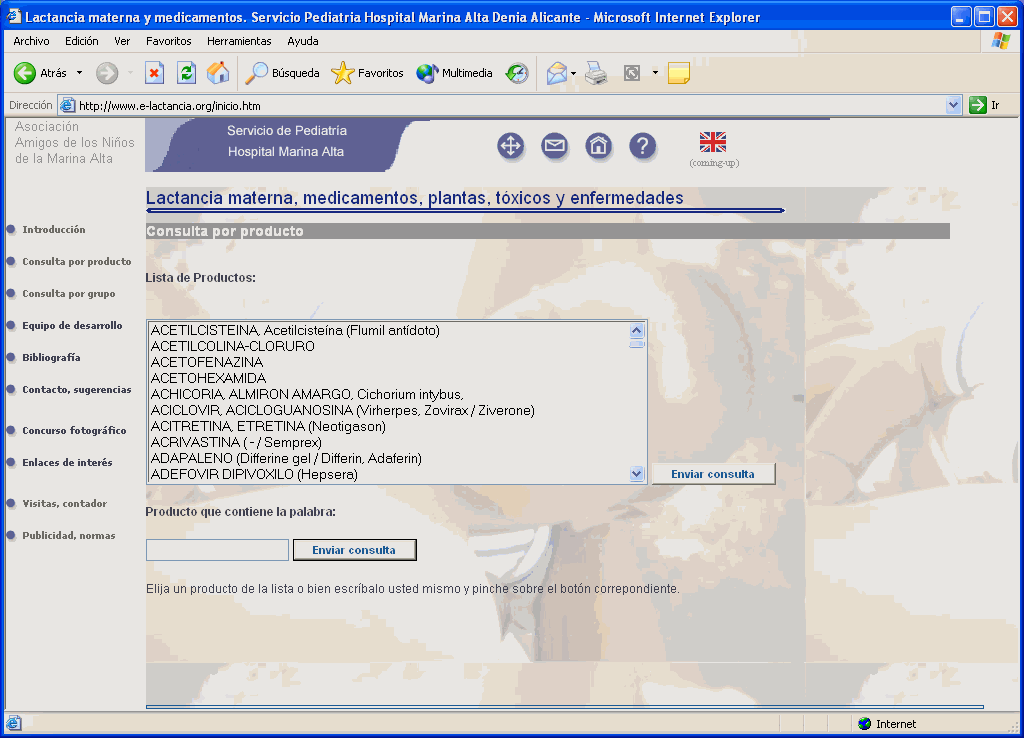 INTRODUCCIÓN La Asociación Española de Pediatría (AEP), la Organización Mundial de la Salud (OMS) y la Academia Americana de Pediatría (AAP), entre otras sociedades científicas, recomiendan la lactancia materna exclusiva hasta los 6 meses de vida y su continuación, con introducción gradual de alimentos, hasta el segundo año e incluso más si madre y niño así lo deciden . Estas recomendaciones están basadas en multitud de datos comprobados científicamente que avalan los importantes beneficios en términos de salud que se derivan para las mujeres y sus hijos, y de tipo económico para familias, sistemas sanitarios y la sociedad en general cuando los niños son alimentados con lactancia materna. El auge que ha tenido en los últimos años la promoción de programas de apoyo a lactancia materna, derivado del inobjetable beneficio para los niños y su familia de este tipo de alimentación, ha motivado un mayor interés entre los pediatras y demás personal sanitario por este tópico, siendo uno de los de mayor preocupación la prescripción de sustancias medicamentosas a las madres lactantes. Un motivo frecuente de cese de lactancia es la necesidad de utilizar una medicación a la madre lactante y el consiguiente consejo de su médico para que deje de lactar, pese a que la mayoría de medicamentos que se prescriben a las mujeres que amamantan no tiene ningún efecto ni sobre la calidad o cantidad de la leche producida por la madre ni sobre la salud o bienestar del niño. La Academia Americana de Pediatría viene realizando un loable trabajo de divulgación entre los pediatras basado en hechos publicados en la literatura científica y que ha plasmado en desde fechas tan tempranas como 1983, con revisiones sucesivas en 1989, 1994 y 2001. Desde 1976 el Estudio Colaborativo Español de Malformaciones Congénitas (ECEMC) dirigido por la Dra Martínez Frías ofrece asesoría para la prevención de malformaciones. Por medio de la Fundación 1000 del mismo grupo, radicada en la Facultad de Medicina de la Universidad Complutense de Madrid, en los últimos años han desarrollado, ente otros un Servicio de Información Telefónica a la Embarazada (SITE) con el fin de que todas aquella mujeres que estando embarazadas y tuvieran que tomar una medicación puedan consultar sobre los factores de riesgo para el desarrollo prenatal. Conocedores desde la Fundación 1000 y el ECEMC de los trabajos que en el campo de la formación - información sobre lactancia materna realizaban los autores del presente trabajo, nos ofrecieron la posibilidad de colaborar con ellos en la atención a este tipo de preguntas y así, desde Noviembre del 2001, derivan todas las llamadas de madres lactantes al teléfono de nuestro lugar de trabajo. Tras el acuerdo con el SITE pudimos comprobar que la consulta sobre medicación durante la lactancia es frecuente como se desprende de nuestra experiencia, máxime por tratarse de un servicio sin promoción. No en vano se sabe que más del 90% de mujeres utilizan algún medicamento en las primeras semanas tras el parto. A fin de poder dar una respuesta científica y fiable de forma rápida a este importante volumen de consultas generado en poco tiempo, decidimos crear una base de datos accesible desde la Intranet de nuestro lugar de trabajo con todos los medicamentos o sustancias sobre las que nos podían consultar, dado que nos encontramos con los siguientes problemas: La información al respecto está muy dispersa, Hay contradicciones o matices sutiles según la fuente consultada, Los listados de fármacos o sustancias pueden no estar en orden alfabético, sino ordenados por grupos terapéuticos, La bibliografía no está en español resultando engorroso el hallar una determinada sustancia a causa de la peculiar grafía anglosajona No siempre se reciben las llamadas en el despacho en el que se encuentra la bibliografía necesaria para resolver una consulta. Tras un periodo de prueba, el fruto de este trabajo nos pareció lo suficientemente importante como para ofrecerlo por medio de Internet a la comunidad científica pediátrica y sanitaria en general; en estos tiempos de la información asequible por la Red creemos que puede ser una herramienta útil y fácil de utilizar por todos aquellos compañeros que diariamente son consultados sobre la idoneidad de una medicación en una madre lactante. Así pues, el objetivo de esta herramienta es: Dotar de una herramienta útil y actualizada de respuesta, científica y fiable, a todos aquellos sanitarios que sean consultados en relación con la toma de fármacos o sustancias afines por la madre lactante por medio de: La creación de un programa informático que permita la consulta puntual de una sustancia farmacológica, generando una respuesta práctica y confiable. La colocación de dicho programa en Internet de forma libre y gratuita para conseguir un acceso universal y rápido. Tras un año y medio de funcionamiento el número de accesos mensuales ha llegado a casi 10.000, desde lugares tan diversos como Estados Unidos y Latinoamérica. La web puede ser accedida en español y en inglés. Actualmente, se está preparando la versión en francés. MATERIAL Y METODOS Se han seguido los siguientes criterios para incluir una sustancia en el fichero de datos:
