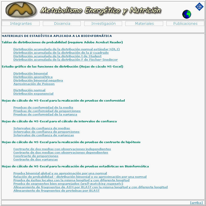 1. Introducción El objetivo de la Bioinformática es aportar a los investigadores de las ciencias de la vida y la salud herramientas que les permitan analizar y asumir la similitud entre dos o más secuencias de ADN o proteínas, localizar genes en el ADN genómico, estimar las diferencias en la expresión de genes entre tejidos o en diferentes situaciones fisiológicas, además de otras [1]. Todos estos procesos involucran a la teoría de probabilidades y la estadística. La estadística, que es un método de razonamiento para describir e interpretar información cuya característica fundamental es la variabilidad, resulta una herramienta imprescindible en Bioinformática para interpretar los resultados de búsquedas en las bases de datos o en el tratamiento de las enormes cantidades de información que proporcionan la genómica, la proteómica y la metabolómica. Un aspecto importante que no debe olvidarse es que la estadística no explica los resultados sino que ayuda a comprenderlos e interpretarlos, al tiempo que nos permite realizar inferencias con un cierto grado de certeza. En la Bioinformática tanto la teoría de probabilidad como la estadística tienen un papel central, ya que esta parte de la ciencia implica el análisis de datos biológicos. Un gran número de mecanismos regidos por el azar están involucrados en la generación de estos datos, por ejemplo, los procesos aleatorios inherentes a la evolución biológica y los procesos no aleatorios del procesamiento de muestras. La teoría de los procesos estocásticos nos ayuda a describir los procesos aleatorios que suceden durante la evolución en el tiempo y el espacio. La evolución Biológica proporciona uno de los ejemplos más complejos de procesos estocásticos que se pueda imaginar [2]. Uno de los problemas más importantes que nos encontramos al explicar estadística es la dificultad que tienen los alumnos e investigadores para asimilar y comprender los conceptos utilizados, de manera que en muchas ocasiones no son capaces de asimilar las implicaciones de los cambios en los parámetros característicos de las diferentes funciones de distribución, o qué debe de suceder para alcanzar un determinado grado de significación en una prueba estadística (P-value). 2. Objetivos El objetivo que nos planteamos fue el diseño de una página Web para facilitar tanto a los alumnos como usuarios el estudio de los procedimientos estadísticos que más frecuentemente se utilizan en Bioinformática, al tiempo que les permitiera estudiar, a través del manejo de una sencilla hoja de cálculo, las formas de las diferentes distribuciones de probabilidad o las pruebas estadísticas que se utilizan. 3. Materiales y métodos En el desarrollo de la página Web se han utilizando diferentes programas comerciales para el diseño de páginas Web (Dreamweaver) y la confección de hojas de cálculo (Microsoft Excel). Decidimos utilizar estos dos programa por la facilidad de su manejo en el diseño de páginas Web y por la amplia implantación de Microsoft Excel. El resultado ha sido el diseño de una página Web a partir de la cual el alumno puede acceder a diferentes secciones: Tablas de distribuciones de probabilidad Estudio gráfico de las funciones de distribución Hojas de cálculo de MS-Excel realización de pruebas de conformidad Hojas de cálculo de MS-Excel cálculo de intervalos de confianza Hojas de cálculo de MS-Excel realización de pruebas de contraste de hipótesis Hojas de cálculo de MS-Excel realización de pruebas estadística en Bioinformática 4. Resultados y discusión El resultado han sido un conjunto de utilidades informáticas a las que el alumno puede acceder a partir de una página inicial (http://gmein.uib.es/bioinformatica/estadistica/) (Figura 1) . En cada uno de estos apartados se accede a diferentes utilidades y pruebas, que abren una hoja de cálculo en la que se pueden introducir y modificar los parámetros, por ejemplo en el caso del estudio de las función de distribución de probabilidad de una binomial, el estudiante puede variar las condiciones y observar las consecuencias sobre la forma de la función de densidad de probabilidad y la función de distribución, de esta manera tan sencilla el alumno puede aprender el significado e implicaciones de los diferentes parámetros que caracterizan cada una de las funciones de distribución de probabilidad (Figura 2). Figura 1: Imagen de la página de presentación. Figura 2: Hoja de cálculo que permite el estudio de la distribución binomial. Los parámetros característicos de la función pueden cambiarse y automáticamente se visualiza el efecto sobre la función de densidad de probabilidad y la función de distribución de probabilidad. En un tercer apartado se introducen las pruebas de conformidad, por ejemplo estudiar si una muestra en la que hemos determinado un parámetro se puede considerar que pertenece a una determinada población, a partir del valor de la media aritmética obtenida en la muestra. La hoja de cálculo permite la introducción de los datos y nos da el resultado de la aplicación de la prueba estadística (Figura 3). En el apartado final se ofrece la posibilidad de realizar diferentes contrastes de hipótesis que se utilizan en Bioinformática, por ejemplo la prueba utilizada por BLAST (Figura 4). En estas hojas de cálculo el usuario puede ir entrando los datos y comprobar sobre la hoja de cálculo el resultado de la prueba estadística, además de visualizar la forma de la función de distribución de la prueba y comprobar el valor del P-value y que resultados deberían darse para alcanzar un determinado nivel de significación. Figura 3: Hoja de cálculo que permite la realización de pruebas de conformidad con la media aritmética. Figura 4: Hoja de cálculo que nos permite realizar la prueba estadística de BLAST en la comparación de secuencias de proteínas. 5. Conclusión La Web se muestra en este caso como una herramienta de gra