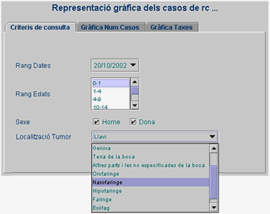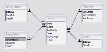 Figura 1: Esquema de entidades El resultado es un applet en el que se representan estos datos. En el distinguimos una primera pestaña en la que se representan los criterios de consulta (figura 2). Estos son generados a partir de las tablas "RangDades", "RangEdats", "Tumors" y "Sexe", de la base de datos.