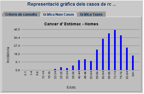 Figura 3: Ejemplo de gráfica de representación de datos. 5. Conclusiones Prácticamente una década después del nacimiento de la WWW, Internet se ha convertido en el medio más ágil para consultar información biomédica. En Medicina, los nuevos descubrimientos se suceden a diario, y la inmediatez con que se ven reflejadas en las páginas Web, es difícilmente superada por otros medios de comunicación. En el campo de la medicina podemos encontrar desde la información más general, hasta la más particular, de la materia que nos interesa; (p. e. una gráfica con la evolución histórica de la incidencia de cáncer de pulmón en Baleares durante los últimos dos años). El avance científico obliga, en parte, a los profesionales relacionados de una manera u otra, con el mundo de la salud y la biomedicina, ha esforzarse en mejorar la calidad de la información, su claridad y veracidad, consiguiendo así su fácil acceso y poniéndola a su vez, al alcance de cualquier usuario de la Web. Este objetivo es el resultado de dos componentes básicos: Por un lado una fuente de información perfectamente capacitada y válida. Por el otro un criterio adecuado para la presentación de esa información, bien estructurada en aplicaciones creativas, simples y atractivas. Referencias [1] H.-O Adami, P. Lagiou y D. Trichopoulos. Identifying cancer causes through epidemiology. En: "The Cancer Handbook", capítulo 19. Editor M.A. Alison, Nature Publishing Group (2001). [2] A. Obrador e I. Garau. Quaderns de Càncer de les Illes Balears. Número 1. Unitat d’Epidemiologia i Registre de Càncer de les Illes Balears (2002). [3] The Source for Java Technology. http://java.sun.com.