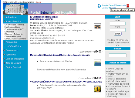 o Mapa de camas / Localización de Pacientes: Aplicación que permite llevar a cabo la gestión del mapa de camas y la localización de pacientes en los controles de enfermería. o Prescripción Electrónica de Farmacia: Sistema de información que implementa el circuito desde la prescripción de fármacos por parte del médico, la validación por parte de Farmacia y la dispensación de medicamentos a través de armarios repartidores Pixis. o Botiquines de Farmacia: Módulo que permite gestionar las peticiones de pedidos farmacológicos a los diferentes botiquines del hospital. o Cuadro de mando: Herramienta que suministra a la Dirección del Hospital los indicadores de gestión necesarios para la toma de decisiones. Presenta la información a través de un entorno visual gráfico y permite, entre otras opciones, la elaboración de informes. o Estación Clínica: Sistema de Información Hospitalario dirigido a agilizar la gestión del trabajo de los profesionales asistenciales. Implementa el proceso asistencial orientándolo a la atención al paciente. Permite la gestión de peticiones clínicas. Actualmente está implantado en la Urgencias del H. Infantil y está prevista su extensión a otras áreas. o Aplicaciones de laboratorios: § Bioquímica y laboratorio de urgencias § Hematología § Inmunología § Microbiología Cardiología Radiología digital Correo electrónico (vía web) Áreas y Servicios: Este gran bloque da cabida a toda la información correspondiente a las áreas o servicios. Actualmente, en pleno proceso de crecimiento, desarrolla hasta ahora los siguientes contenidos: Comisión de farmacia y Guía farmacológica: Desarrollar la Guía Farmacoterapéutica para su utilización en el hospital y asegurar su actualización constante. o Archivo central de historias clínicas: Informes de la actividad mensual acumulada en la producción de historias clínicas de los servicios y secciones de hospitalización. o Biblioteca: Pone a disposición de los usuarios los servicios y fondos disponibles para facilitar la labor asistencial, docente e investigadora. Contiene los siguientes apartados: Información general;Guía para la utilización del catálogo; Consulta del catálogo; Búsqueda local en Medline, Cancerlit y Cinahl; Direcciones útiles de internet; Horario y servicios.Imagen y fotografía: información de los trabajos que realiza y formulario de petición de servicios. Formularios En esta sección el usuaro puede obtener modelos de formularios con los que habitualmente se trabaja: peticiones, justificantes, notificaciones, solicitudes. Listín telefónico Apartado absolutamente necesario, que agiliza la búsqueda de números de tel. de todo el complejo hospitalario. Incluye un buscador de teléfonos por servicio, departamento, unidad, y centro. Documentos Esta zona alberga los documentos para ser consultados en cualquier momento por los usuarios. Por lo general, son documentos pdf y están clasificados por categorías: boletines, memorias del hospital, memorias de investigación, calidad, plan de futuro, noticias, convocatorias, cursos, MIR, etc. Formación: Se trata de una sección en una fase incipiente que contendrá toda la información relativa a la formación de los profesionales del hospital. Está planificado incluir cursos interactivos on line; Accesos y descarga de otros cursos institucionales. Guía del trabajador o manual de acogida: Apartado que ofrece toda la información de carácter interno de nuestro entorno de trabajo. Zona de usuario: Tu cuenta; Enviar noticias; Top 10; Tópicos; Estadística del portal. B. Zona central Se trata del cuerpo principal del portal intranet donde se suceden todas las noticias de interés prioritario. Estas noticias se suceden de acuerdo a un criterio clasificación: Anuncios, información, cursos, congresos, documentación, notas de prensa, etc. C. Zona secundaria Sección en vías de transformación, en la que actualmente aparece un buscador del portal, una sección de enlaces de interés, plan de futuro, notas de prensa. Y muy pronto se incorporarán congresos, el boletín digital del hospital, un tablón de anuncios. CONCLUSIONES Según Nieto Pajares "una intranet o portal interno de un centro hospitalario es un punto de acceso a los contenidos, sistemas de información y aplicaciones del centro basadas en tecnologías web". En este sentido, la intranet del HGUGM se ha desarrollado como portal común de acceso a la información y entorno de trabajo de los usuarios. La UTI.HGUGM. tiene 7000 usuarios potenciales y multidisciplinares. La gran magnitud de nuestra organización es susceptible de generar una cantidad ingente de información con su correspondiente valor añadido y esto plantea una gran dificultad en la unificación del entorno, pero no por ello no abordable. El resultado final solo puede traducirse en ventajas: Accesibilidad desde cualquier PC del Hospital Usabilidad: facilidad de empleo por los usuarios Supone un canal de comunicación interno global que integra todas las aplicaciones y contenidos. Nuestra meta a medio plazo es precisamente abordar esa unificación sin que cada una de las partes o subsistemas y pierdan su identidad. La herramienta aglutinadora será nuestra intranet y aunque no esté destinada a solucionar problemas de todo tipo, al favorecer la comunicación entre distintos servicios, facilita enormemente el proceso de la búsqueda de soluciones. BIBLIOGRAFIA Gonzalez, T. "La intranet, una herramienta hospitalaria óptima". 23/6/00 Diario Médico Gómez, A. y otros "Creación e implementación de una intranet hospitalaria" Simposio argentino de informática y salud. Nieto P., J. F. "La magia del clic: intranet en hospitales: usos, criterios y posibilidades. GalenoWeb; experiencia del hospital Nuestra Señora de Sonsoles.