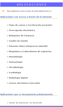Consta de un menú principal (a la izquierda), una zona central de noticias y a la izquierda una zona secundaria con elementos no fijos por el momento. A. Menú principal Aplicaciones: A través de este apartado los profesionales pueden acceder a todas las aplicaciones desarrolladas en entornos Web. Es la puerta de entrada a las aplicaciones hospitalarias.