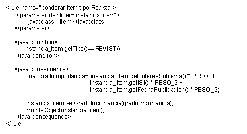 Este módulo se encarga de decidir aquellos items que por su calidad e interés para la Unidad, deben ser almacenados en la base de datos de BIKMAS. El filtrado de los items se desarrolla en dos etapas: evaluación del item, y filtrado del item. En la etapa de evaluación se le asigna un grado de importancia al item haciendo uso de las siguientes clases de conocimiento: 1) criterios de evaluación, almacenados en forma de reglas en una base de conocimiento, 2) conocimiento sobre los temas y subtemas que contempla el sistema y de la importancia que tienen estos para la unidad, y 3) conocimiento relativo a los orígenes de datos contemplados por BIKMAS y la calidad de estos. En la etapa de filtrado, el sistema, teniendo en cuenta los resultados obtenidos en la etapa de evaluación, así como el conocimiento relativo a los criterios de filtrado, decide el almacenamiento o no de un item. Los criterios de filtrado se almacenan en forma de reglas en una base de conocimiento. 2.2. Módulo de Distribución de items de información BIKMAS es capaz de decidir automáticamente que items se podrían utilizar en qué usos. De esta labor se encarga el módulo de distribución de items. Los usos son definidos por los usuarios a partir de una serie de características (nombre, tipo de uso, temas y subtemas relacionados con el uso, periodo de validez, etc). El proceso de distribución se compone de una sola etapa, distribución, la cual se sirve dos clases de conocimiento: conocimiento de distribución, almacenado en forma reglas en una base de conocimiento, y conocimiento relativo a los usos definidos por los usuarios. Este módulo incorpora un mecanismo de publicación de contenidos basado en RSS [3] que permite a BIKMAS compartir información con otros sistemas. 2.3. Módulo Estadístico BIKMAS elabora una serie de estadísticas que informan sobre el tipo, calidad y cantidad de conocimiento manejado por la unidad, así como el tipo de conocimiento que la unidad necesita. Concretamente, BIKMAS elabora las siguientes estadísticas: Porcentajes ordenados por temas de items descartados Número de items por tema y subtema Número y tipo de items introducidos por cada usuario Temas y subtemas requeridos por la unidad Temas y subtemas requeridos por los usuarios BIKMAS tendrá en cuenta parte de esta información, concretamente las estadísticas sobre los temas y subtemas requeridos por la unidad, para determinar las demandas de información que hay en un momento dado, y modificar automáticamente sus criterios de evaluación en la fase de filtrado de items. 2.4. Módulo de Consultas El módulo de consultas permite realizar una gran variedad de consultas a BIKMAS. Estas consultas se pueden agrupar en 3 grupos: 1) consultas de items, centradas en la recuperación de items de la base de datos (ejemplo: dame los items del tema ‘biochips’ introducidos en BIKMAS desde ‘marzo del 2002’, o dame todos los items que puedan tener utilidad para el uso ‘curso de Bioinformática de la Universidad de Oviedo’ definido en la categoría de usos ‘Cursos’); 2) consultas sobre el sistema, mediante las cuales se puede conocer la configuración del sistema (ejemplo: ¿Qué temas y subtemas considera actualmente BIKMAS?) y 3) Consultas relativas a los usuarios de BIKMAS (ejemplo: ¿Que usuarios poseen conocimiento sobre ‘biochips’?, ¿Qué usuario necesita conocimiento sobre ‘Ontologías’?, etc.) 3. El Sistema Basado en el Conocimiento de BIKMAS Para implementar las funciones de filtrado y distribución de items se ha optado por emplear técnicas procedentes del campo de la Ingeniería del Conocimiento. Esta decisión se fundamenta por los siguientes motivos: 1) necesidad de un conocimiento específico del dominio. Dicha información es difícil de recoger en procedimientos algorítmicos clásicos de carácter general. Los métodos basados en el conocimiento aportan soluciones para la adecuada representación y estructuración de dicho conocimiento, y 2) variabilidad del conocimiento. Los criterios de filtrado y distribución de items pueden variar a lo largo del tiempo. Los métodos basados en el conocimiento plantean arquitecturas abiertas que aportan flexibilidad para la modificación de estos criterios sin necesidad de reprogramar el sistema. Para implementar el Sistema Basado en el Conocimiento de BIKMAS se ha optado por utilizar el API Drools [4] para Java por su flexibilidad y potencia. Esta API maneja reglas en formato XML como las que se muestra en la Figura 3.