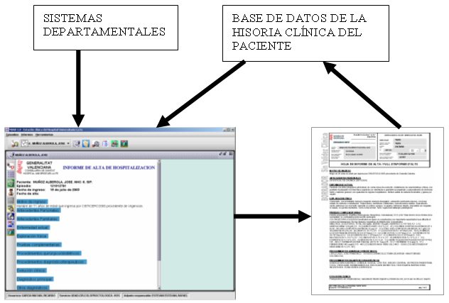 Figura 1. Proceso de elaboración de un informe clínico. También es interesante el pensar en este editor como en una especie de "diario" sobre el episodio del paciente. Esto tiene mucho sentido en un informe de alta de hospitalización, el facultativo puede empezar con la edición del informe en el ingreso del paciente, e ir ampliándolo a medida que el paciente va evolucionando, para finalizarlo con la firma en el momento en el que el paciente sea dado de alta. Así pues los objetivos que se consiguen con este editor de informes son: Editar un informe de alta normalizado para guardar en el archivo y entregárselo al paciente. Tener un lugar donde el facultativo pueda ir registrando la información clínica de un paciente desde el momento de su ingreso en el hospital hasta que se le da de alta. Integrar toda la información clínica del episodio en el sistema de información central del hospital y hacerlo accesible a todo el hospital.