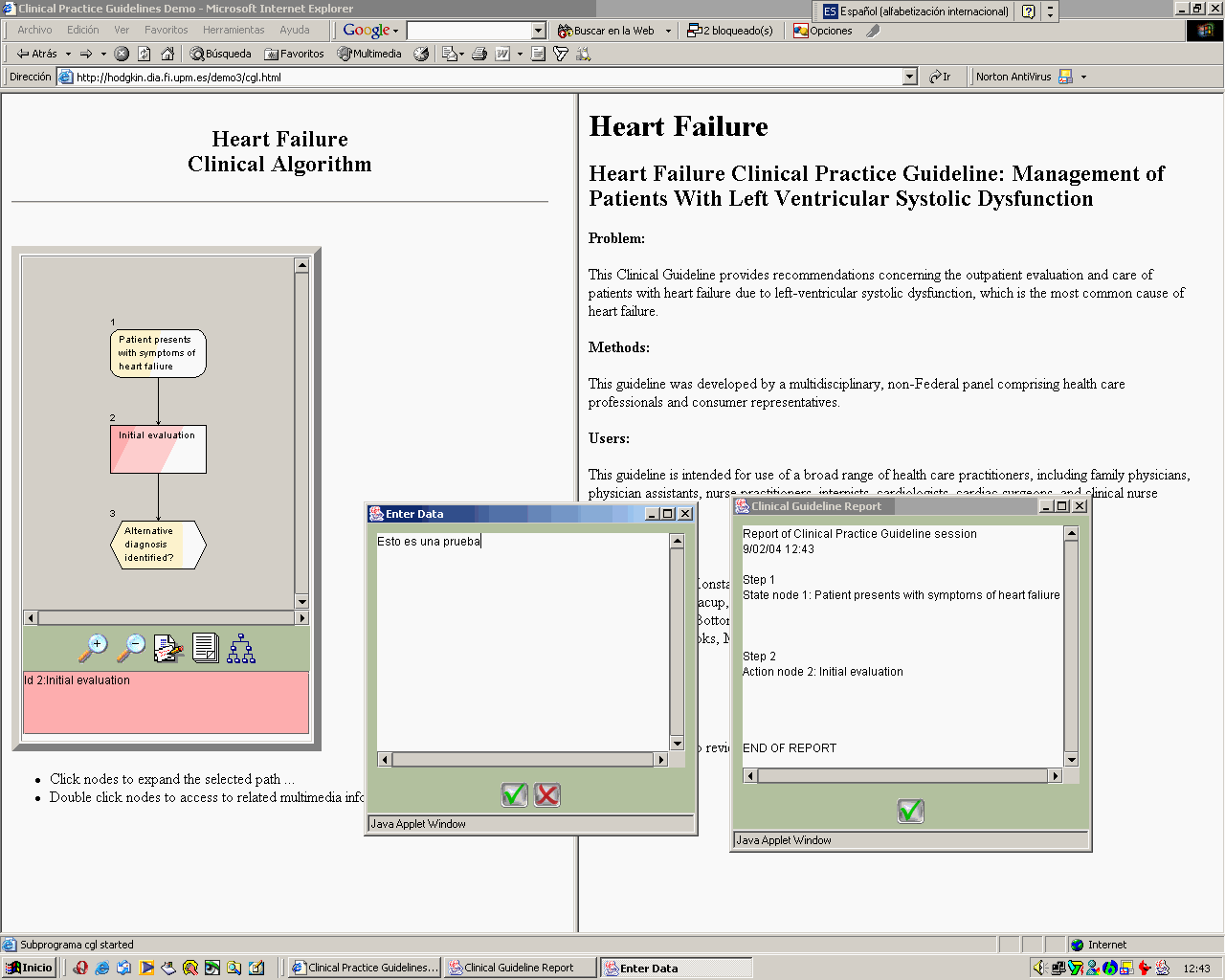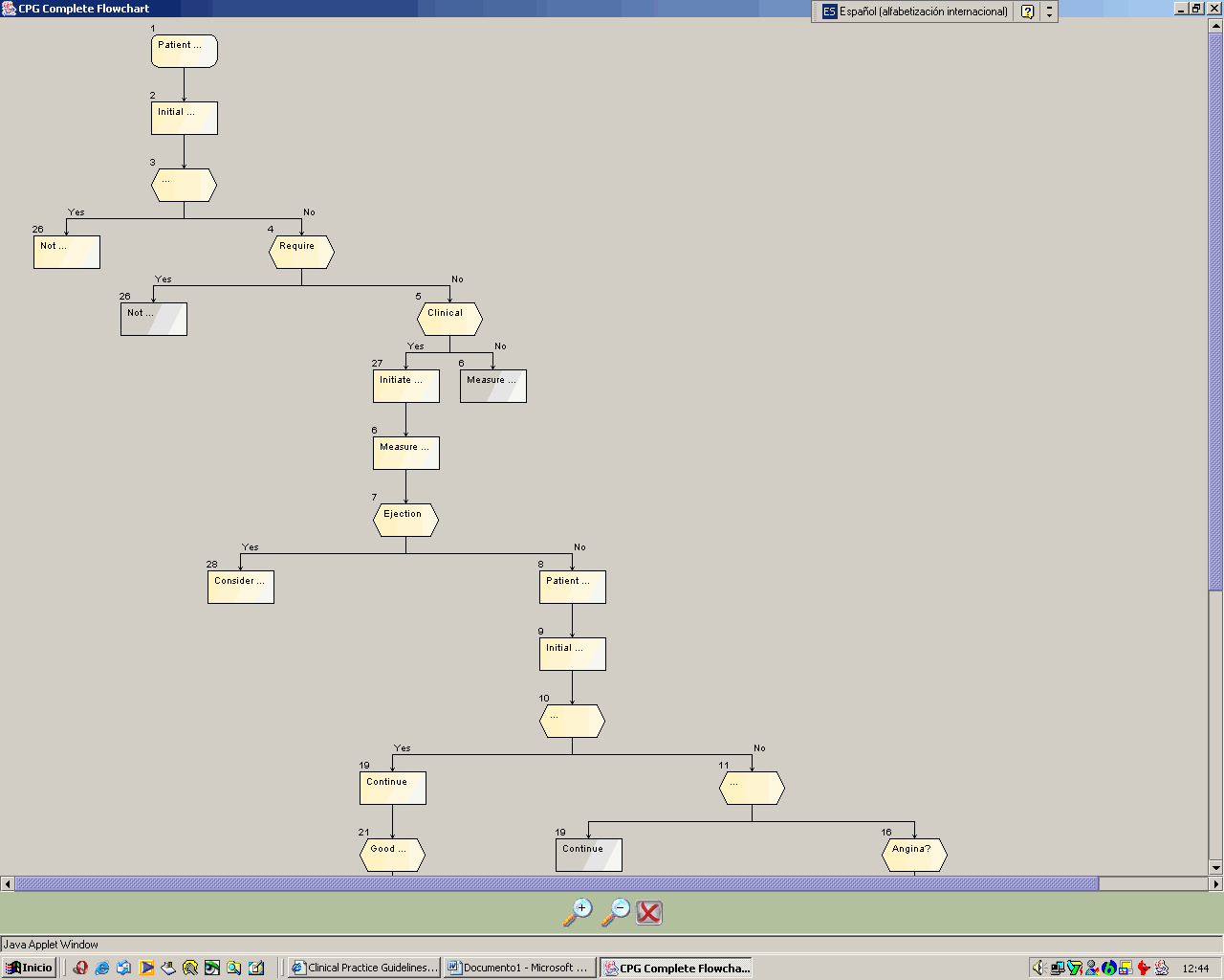 3.3. Asistente a la navegación Esta herramienta está pensada para dar soporte a la navegación del usuario final. Basada en un navegador de Internet, el sistema dividirá en ventanas la pantalla y en ellas se visualizarán las imágenes descritas a continuación. Figura 4: página de marcos del interfaz correspondiente al módulo asistente a la navegación.La figura 4 representa el aspecto que presenta esta utilidad para el usuario. En el marco izquierdo, aparece el diagrama de flujo con los pasos secuenciales a dar y una breve explicación de los mismos. En el marco de la derecha, aparecerá la página web de la base de datos a la que se esté realizando la consulta cuando se seleccione con el ratón en el diagrama de flujo. Dos applets permiten la entrada de datos por parte del usuario y la lectura y zoom sobre todo el protocolo para personalizar la navegación. Los nodos del diagrama de flujo, además de enlazar con páginas web y bases de datos, permiten la incorporación de contenidos multimedia, como videos o animaciones, lo que introduce un valor añadido a la herramienta como elemento de formación. En la figura 5 se aprecia un diagrama con las ramas y las características de los nodos: un cuadrado de esquinas romas manifiesta estado; un cuadrado, acción y, un hexágono, una decisión.